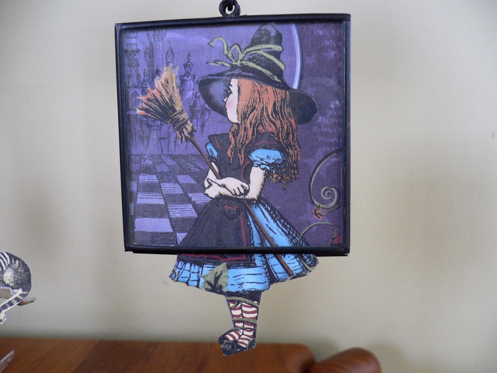 close up of backside made with Halloween in Wonderland paper---cut out the individual cards and mounted them over Tim Holtz filmstrip ribbon